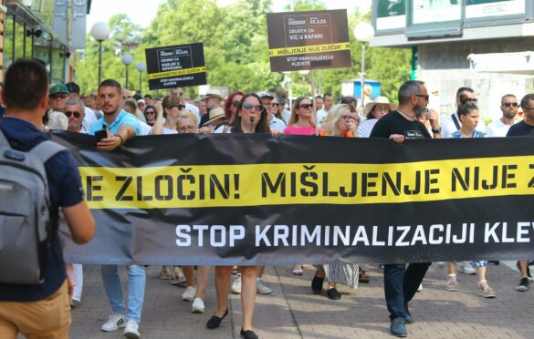 Novinari, medijski radnici, predstavnici civilnog sektora i građani, okupili su se jutros na Trgu Krajine u Banjaluci, odakle su se u znak protesta uputili do Narodne skupštine koja će na današnjoj sjednici raspravljati o Prijedlogu zakona o izmjenama i dopunama Кrivičnog zakonika RS, a kojim se kao krivično djelo u Srpskoj uvodi kleveta.