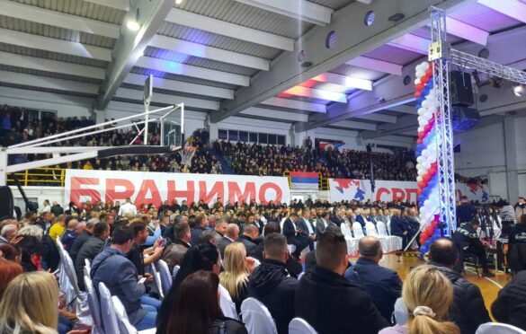 Na mitingu “Branimo Srpsku” okupio se veliki broj građana Bijeljine i susjednih opština, a sala je bila okićena transparentima i plakatima “Branimo Srpsku”, “Ne damo Republiku Srpsku”, “Mi znamo šta branimo, oni ne znaju šta napadaju”…