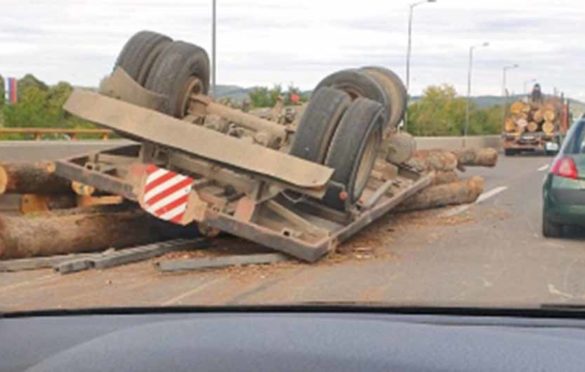 Prikolica šticar kamiona koja je prevozila drva prevrnula se kod “Roguljić” pumpe kod Trna.