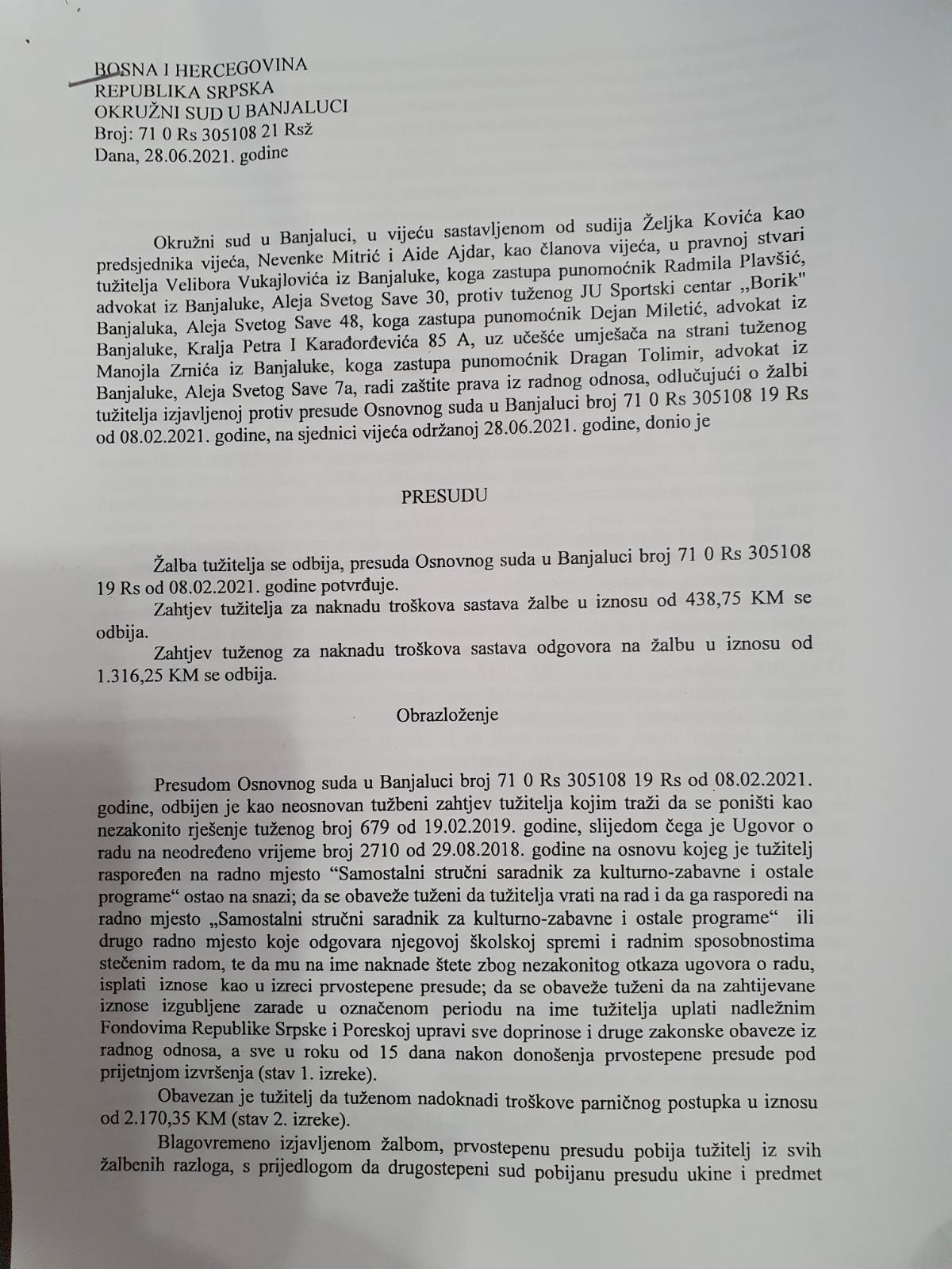 Stanić je pokazao i fotokopiju presude banjalučkog Okružnog suda iz juna ove godine kojom se potvrđuje zakonitost otkaza.