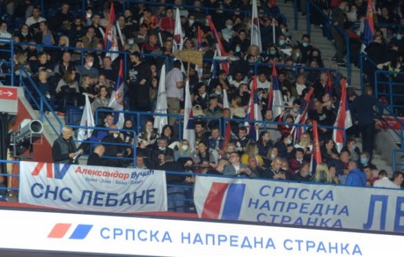Predsednika Aleksandra Vučića su okupljeni, po ulasku u Arenu, pozdravili dugotrajnim aplauzom i povicima “Aco, Srbine”, dok je na tribini razvijen veliki transparent sa Vučićevim likom, zastavom i grbom Srbije.
